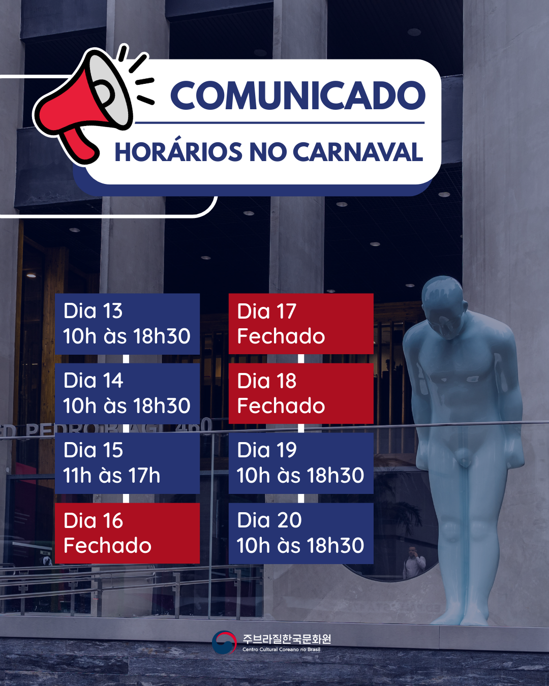 주브라질한국문화원은 카니발 연휴로 인해 오는 2월 16일, 17일, 18일 휴무합니다.