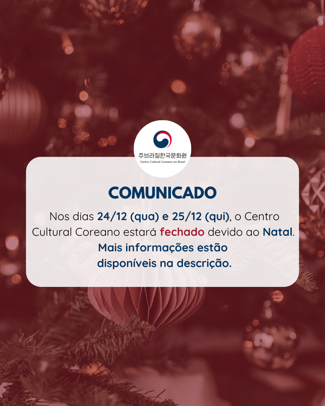 Comunicamos que nos dias 24 e 25 de dezembro não haverá expediente no Centro Cultural Coreano no Brasil devido ao Natal.