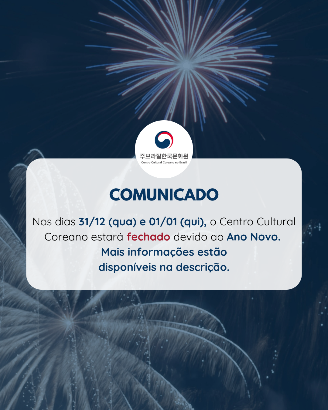 Comunicamos que nos dias 31 de dezembro e 1° de janeiro não haverá expediente no Centro Cultural Coreano no Brasil devido ao Ano Novo.