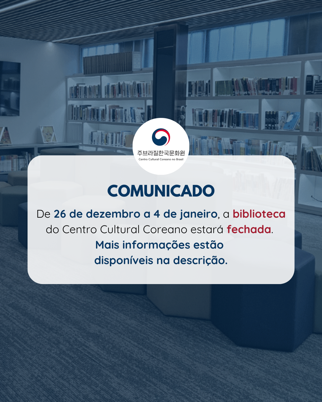 De 26 de dezembro de 2025 a 04 de janeiro de 2026, a biblioteca do Centro Cultural Coreano no Brasil estará fechada para visitação.