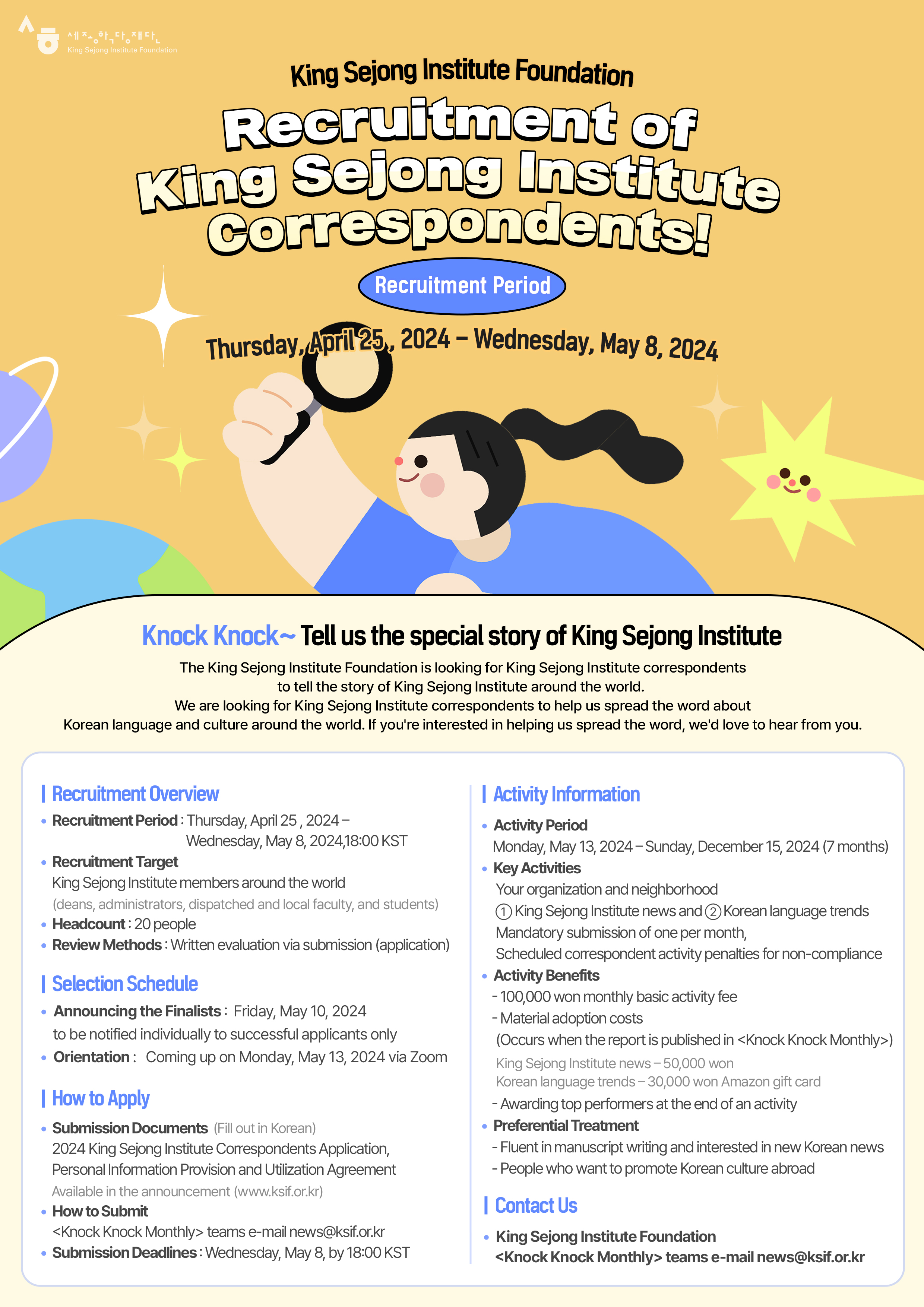O King Sejong Institute Foundation (em português, Fundação Instituto Rei Sejong) está procurando por pessoas que estejam interessadas em serem correspondentes da instituição, divulgando a cultura e língua coreanas ao redor do mundo.