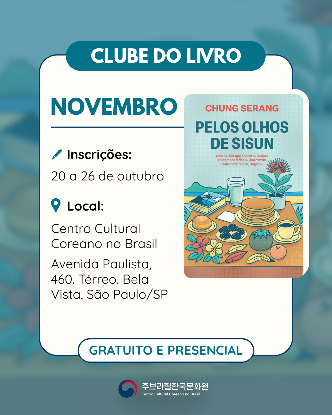 A fim de promover a literatura coreana traduzida para o português no Brasil, o Centro Cultural Coreano no Brasil (CCCB) anuncia a abertura das inscrições para o encontro de novembro do seu clube do livro, no qual será discutido o livro Pelos Olhos de Sisun, de Chung Serang, em sua primeira obra lançada em português no Brasil. Por meio da história da protagonista Shim Sisun, a obra lança uma perspectiva esperançosa sobre um futuro matrilinear e insufla uma lufada de ar fresco em todo o cenário cultural.