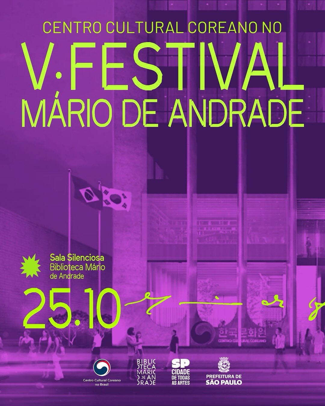 O Centro Cultural Coreano no Brasil (CCCB) participa do V Festival Mário de Andrade, que acontece de 24 a 26 de outubro, em comemoração ao centenário da Biblioteca Mário de Andrade. O evento reúne uma programação gratuita e diversa, com teatro, música, cinema e gastronomia.