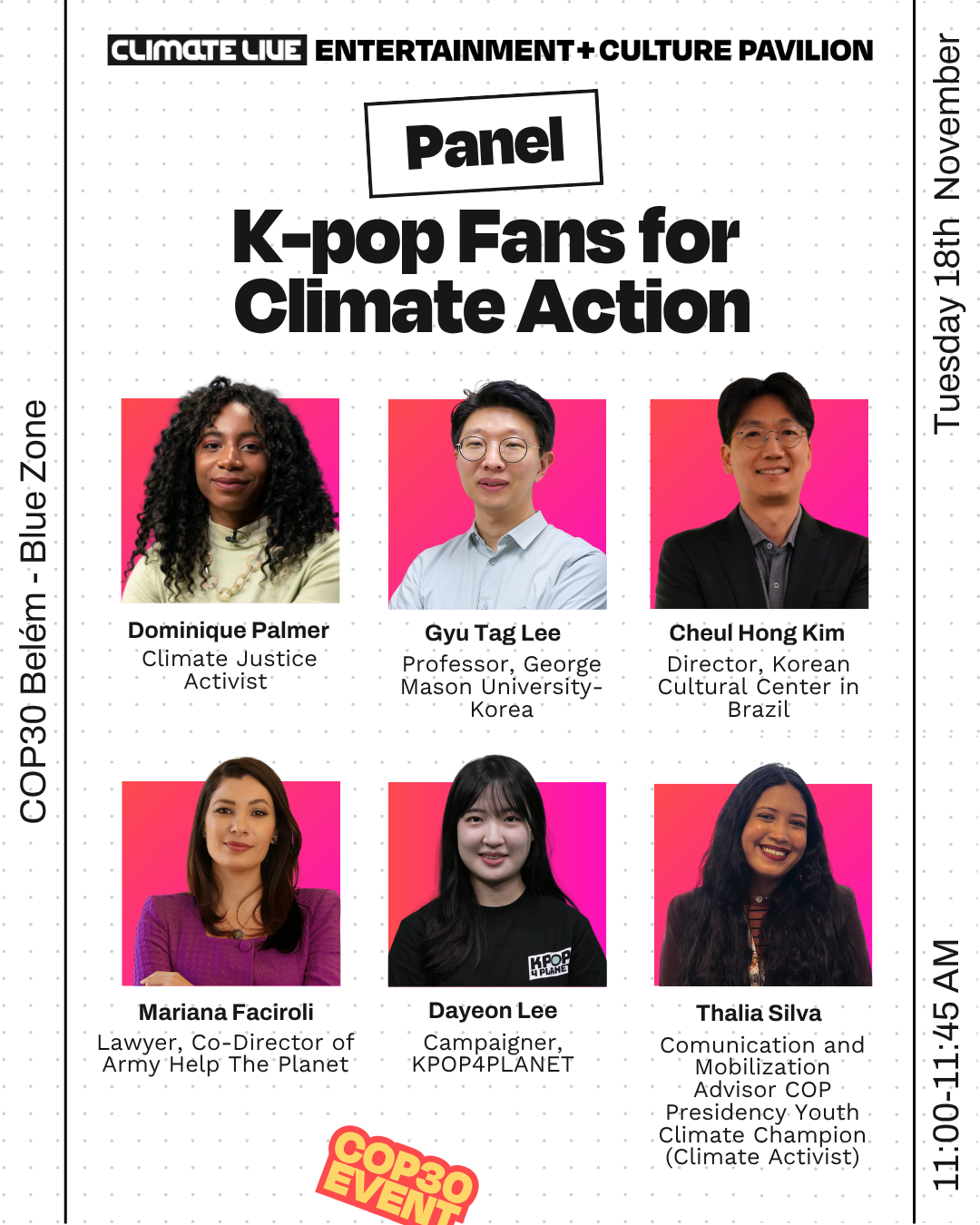 No dia 18 de novembro, o Centro Cultural Coreano no Brasil (CCCB), em parceria com o Entertainment + Culture Pavilion e o Climate Live, realiza o painel “K-pop Fans for Climate Action” na Zona Azul da 30ª Conferência das Nações Unidas sobre Mudança do Clima (COP30), a ser realizada em Belém/PA.