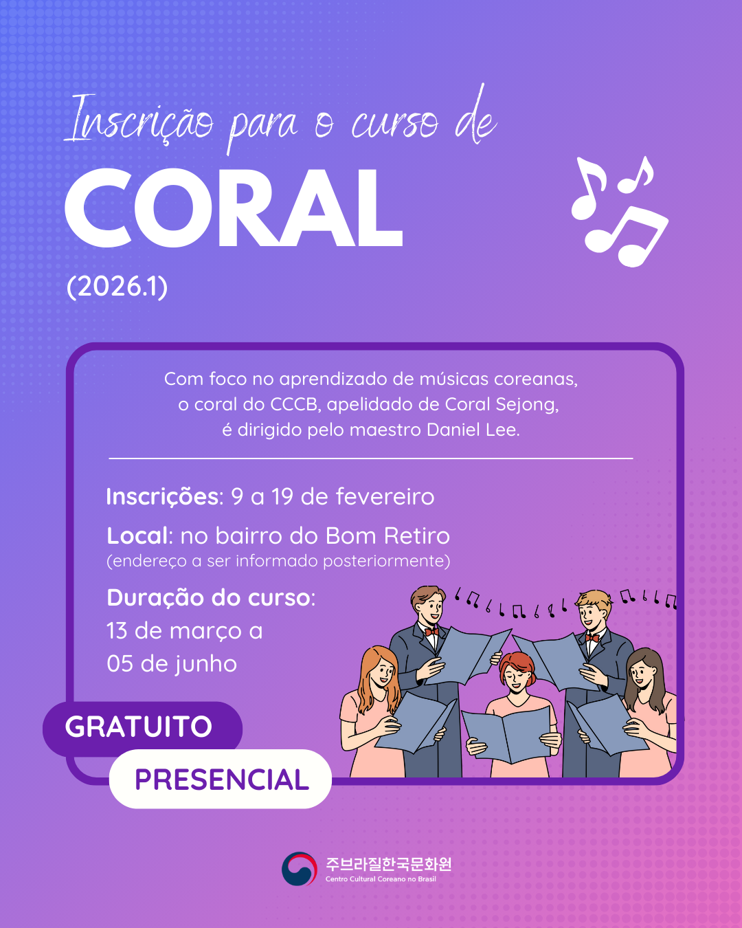 O Centro Cultural Coreano no Brasil (CCCB) informa que a inscrição para o 1º semestre do curso de Coral será aberta no dia 9 de fevereiro, às 10h (horário de Brasília).